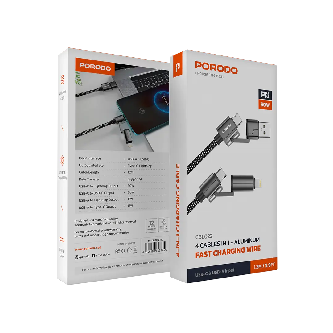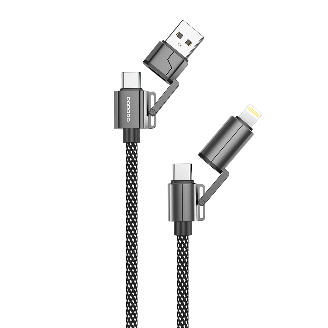 - مقاوم: - **4 کابل در 1:** • USB-C به USB-C (60W PD) • USB-C به Lightning (30W) • USB-A به USB-C (15W) • USB-A به Lightning (12W) - **طول کابل:** 1.2 متر - **ساختار:** روکش بافتهشده + کانکتور آلومینیومی